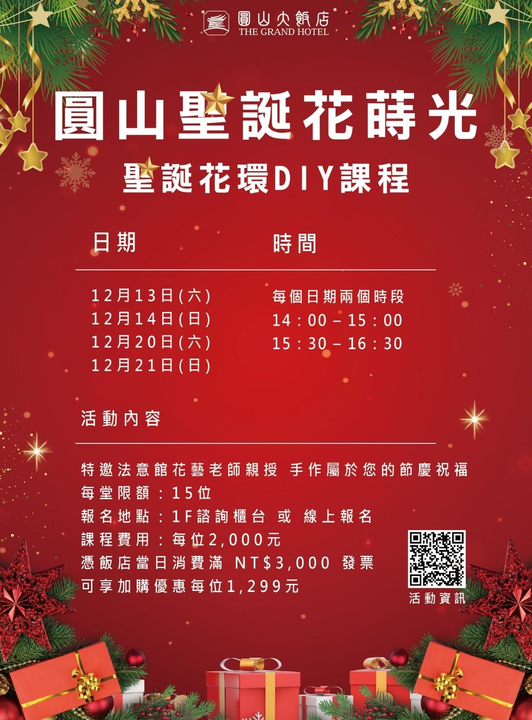 即日起,會員尊享 1299 元加購優惠(原價 2000 元),無需滿額消費,即可報名圓山限定聖誕花環課程。