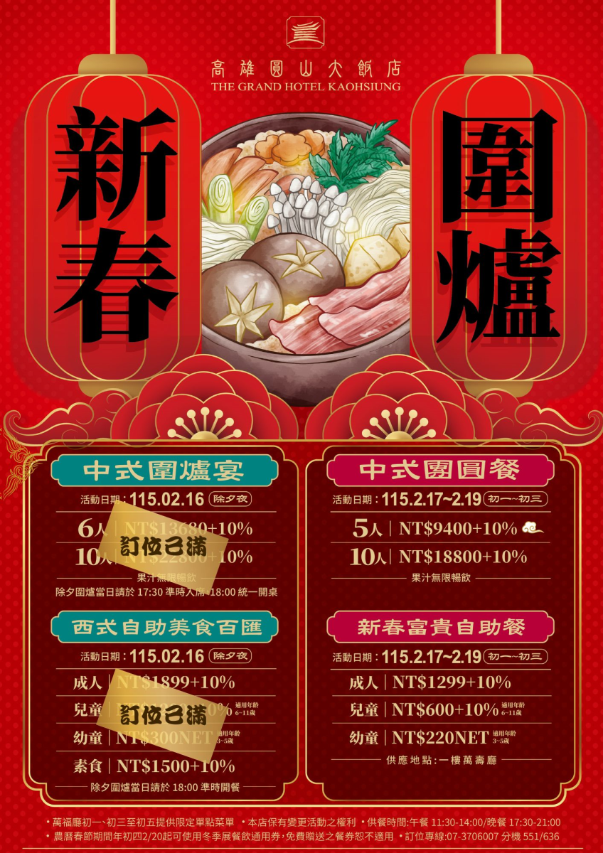 * 除夕圍爐當日請於17:30準時入席,18:00統一開桌