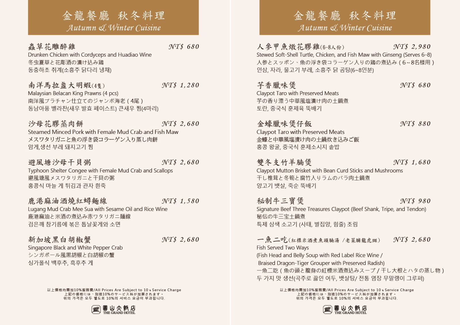 金龍餐廳以當令食材打造全新秋冬佳餚,將蟹黃的濃醇、蟹肉的鮮美,與多元烹調手法完美結合,為饕客獻上一場秋日盛宴。